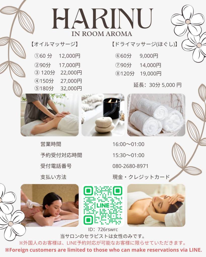 ✿ホテル出張アロマトリートメントサロン「HARINU In Room AROMA」です。